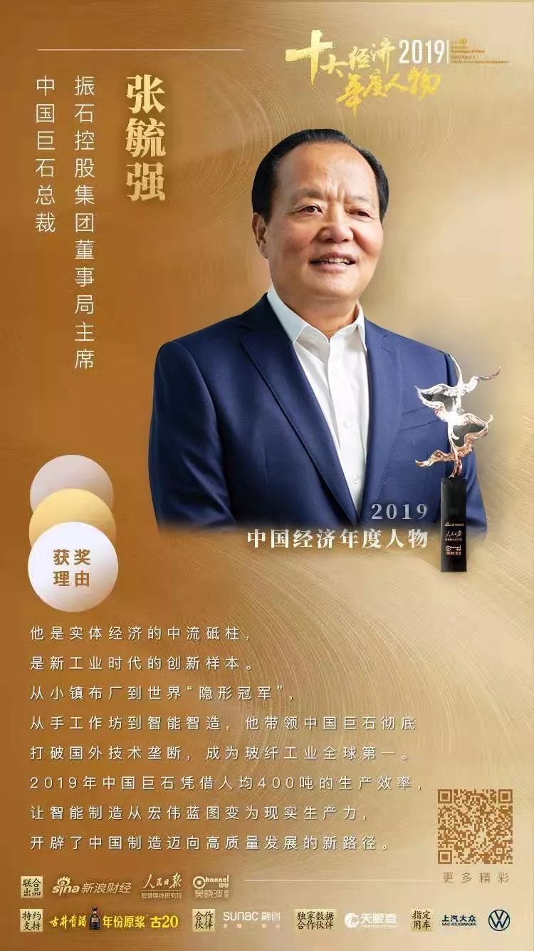 今晚,“致敬時(shí)代驅(qū)動(dòng)力——2019十大經(jīng)濟(jì)年度人物”頒獎(jiǎng)典禮在北京隆重舉行。振石控股集團(tuán)董事局主席、中國巨石總裁張毓強(qiáng)當(dāng)選“2019十大經(jīng)濟(jì)年度人物”,與他一同獲獎(jiǎng)的還有宗慶后、李寧等一批知名企業(yè)家!