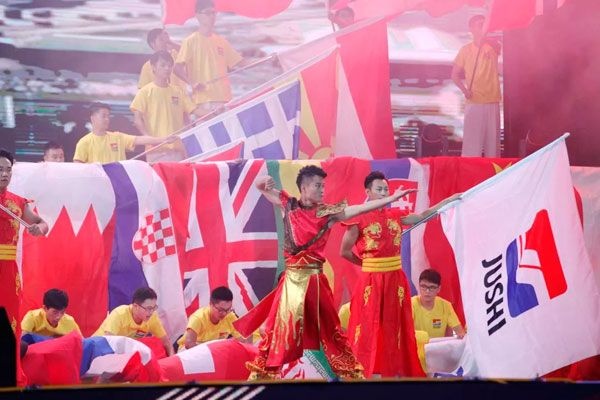 巨石產品遠銷全球,巨石旗和數(shù)十面國旗在舞臺上縱情揮舞,五彩飄揚的旗幟展現(xiàn)出巨石人勇敢走出去、堅定走下去、健康走回來的自信與豪邁。