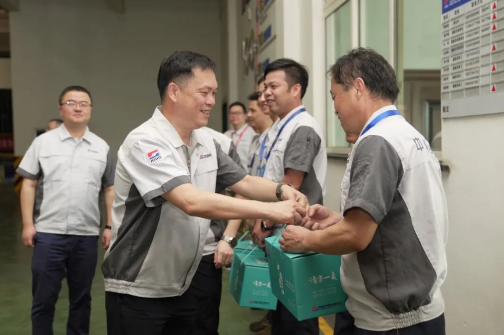 “大家辛苦了!感謝大家!”在五分廠和磊石公司,楊國明總裁如一位老友一般親切慰問熱情堅守生產(chǎn)一線的員工,向他們給予最衷心的感謝和親切的慰問,為他們一一送上清涼,叮囑他們要做好防暑降溫工作,共同對抗高溫,保障生產(chǎn)。他叮囑相關(guān)負(fù)責(zé)人要密切關(guān)注氣溫變化,認(rèn)真落實防暑降溫措施,備齊防暑藥品,切實保障員工健康權(quán)益。