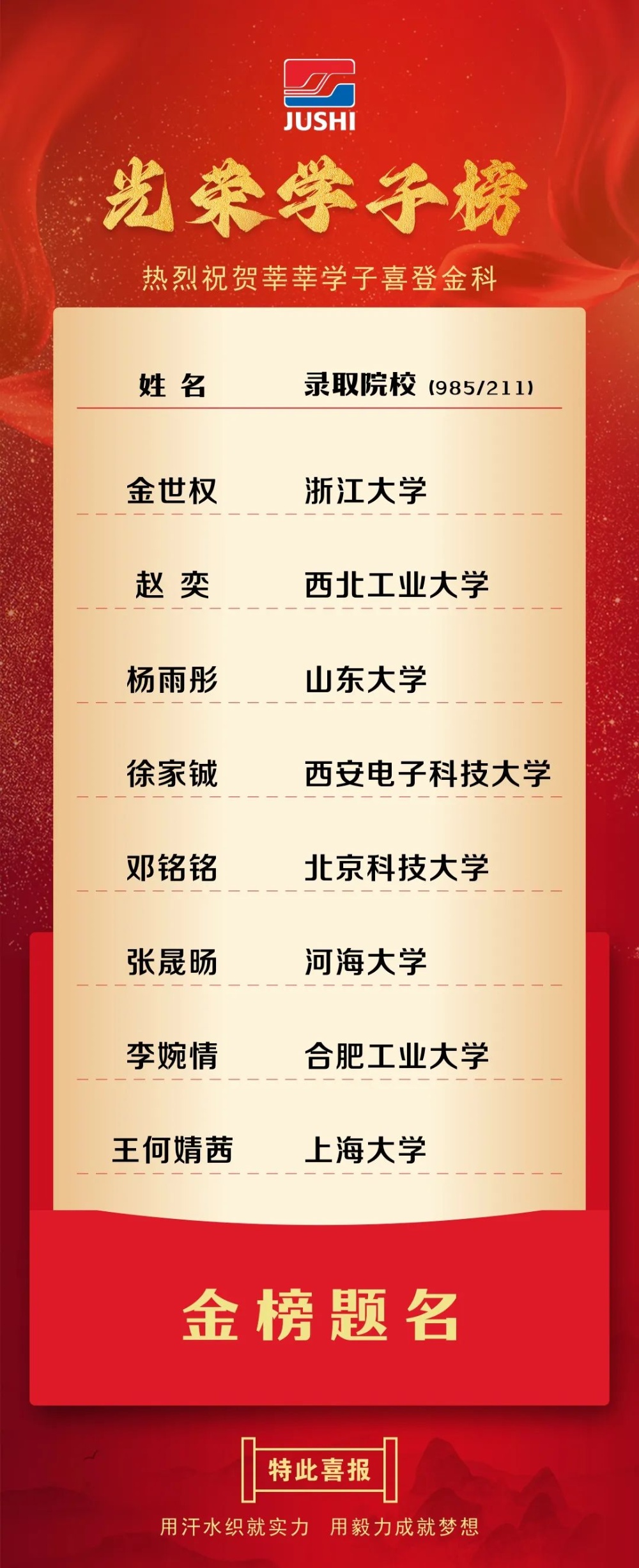 “我要特別感謝巨石為我們提供了一個(gè)穩(wěn)定的學(xué)習(xí)環(huán)境,也感謝所有支持和關(guān)心我們成長(zhǎng)的巨石家人們。巨石設(shè)立的‘勤學(xué)獎(jiǎng)’不僅是對(duì)員工的關(guān)心關(guān)愛和對(duì)培養(yǎng)下一代的重視,更是對(duì)所有同學(xué)努力追求知識(shí)、鍛煉自我的激勵(lì)。我的父母都是樸實(shí)的勞動(dòng)者,他們也許在學(xué)習(xí)上幫不了我太多,但他們身上蘊(yùn)含的做人的道理和生活的智慧讓我受益匪淺。” 準(zhǔn)浙大學(xué)子金世權(quán)表示將繼續(xù)銘記“勤學(xué)”的精神,勇往直前。