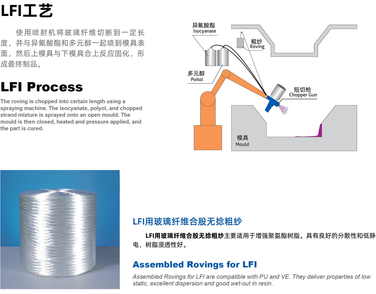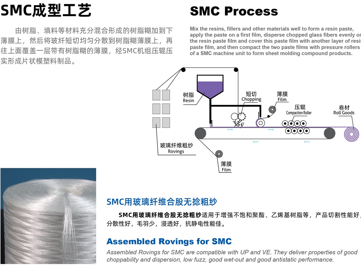 | 440 | 短切分散性好,模壓流動性好制品機(jī)械強(qiáng)度高 Excellent choppability and dispersion, good mold flowability,high mechanical strength of composite products | 門皮、汽車部件 Door skins, automotive parts |