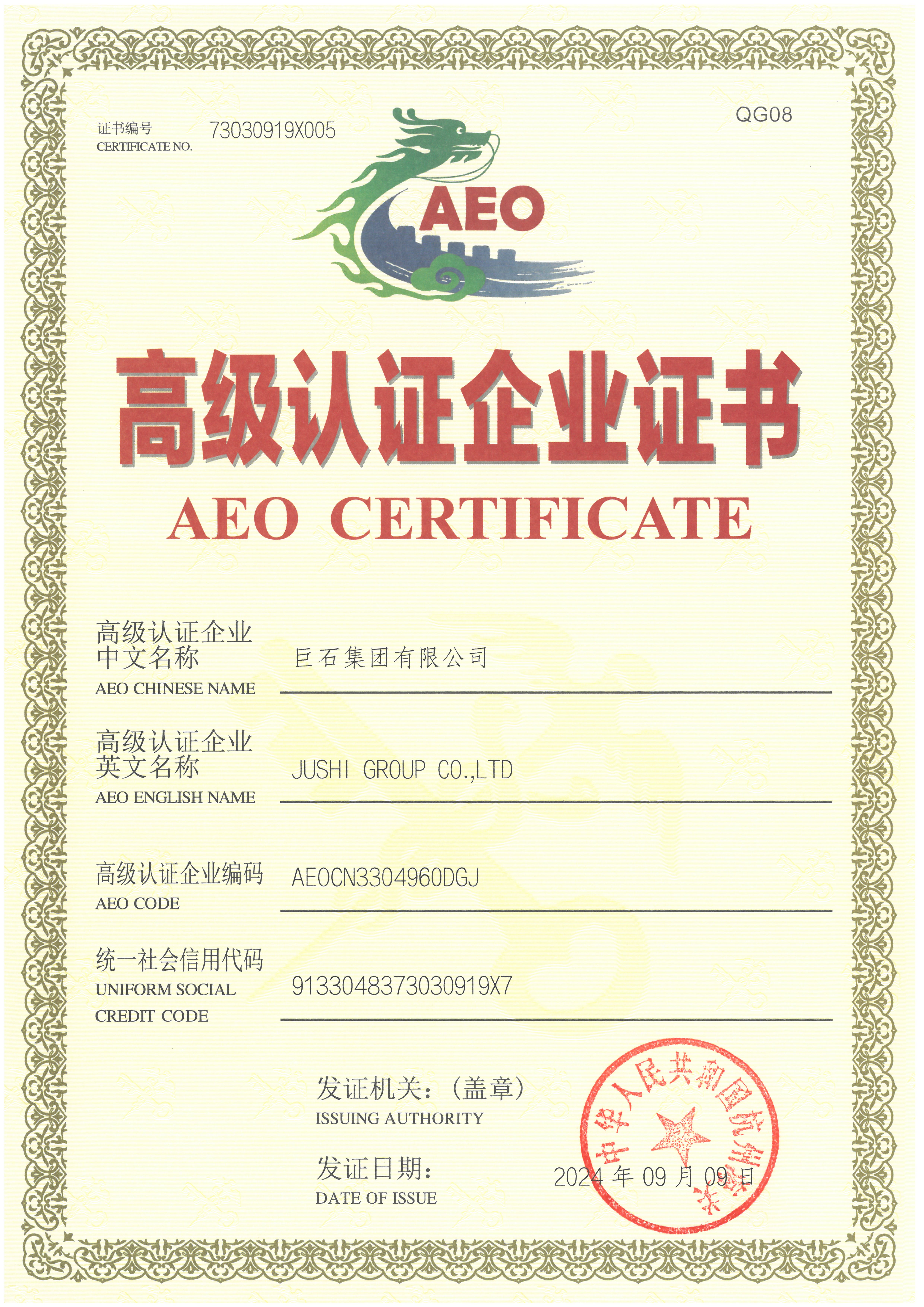 海關(guān)AEO高級認(rèn)證企業(yè)證書